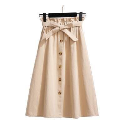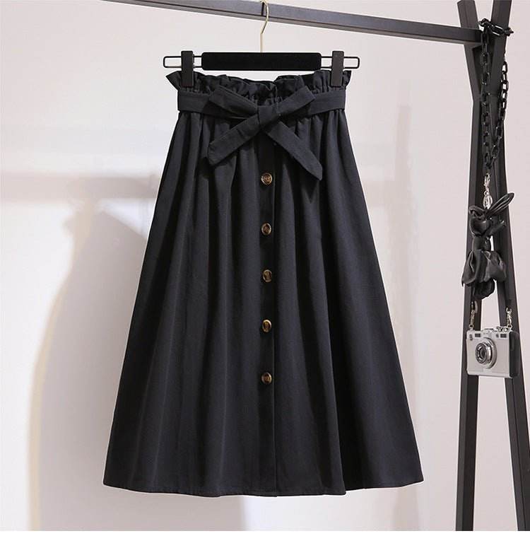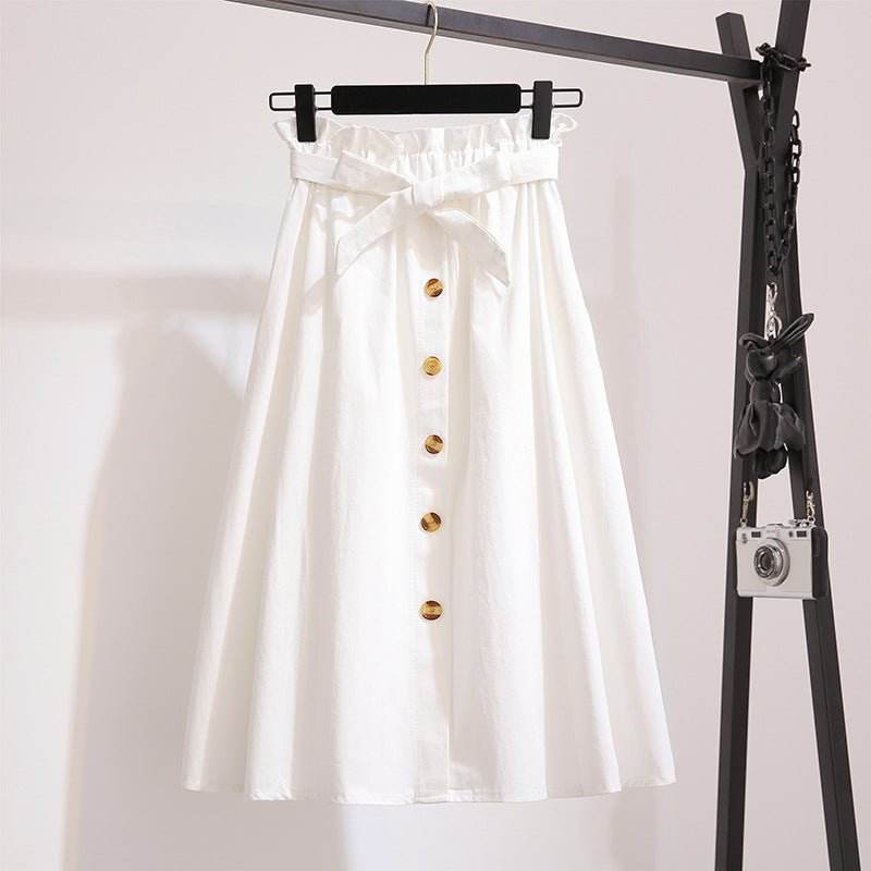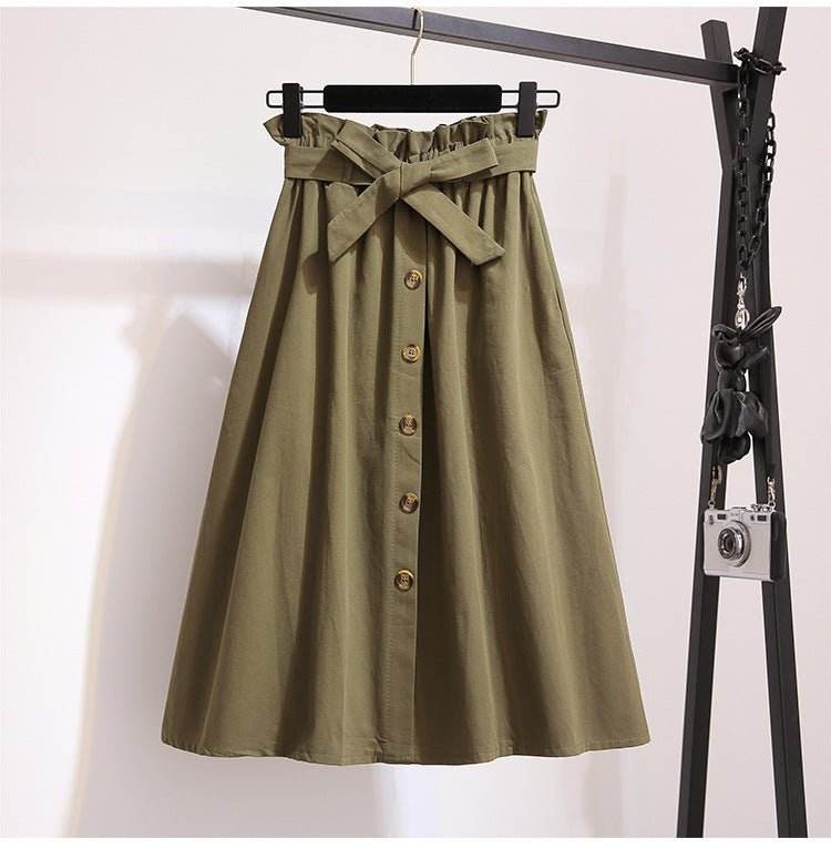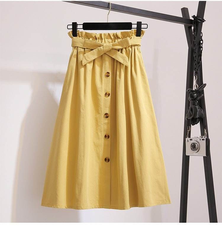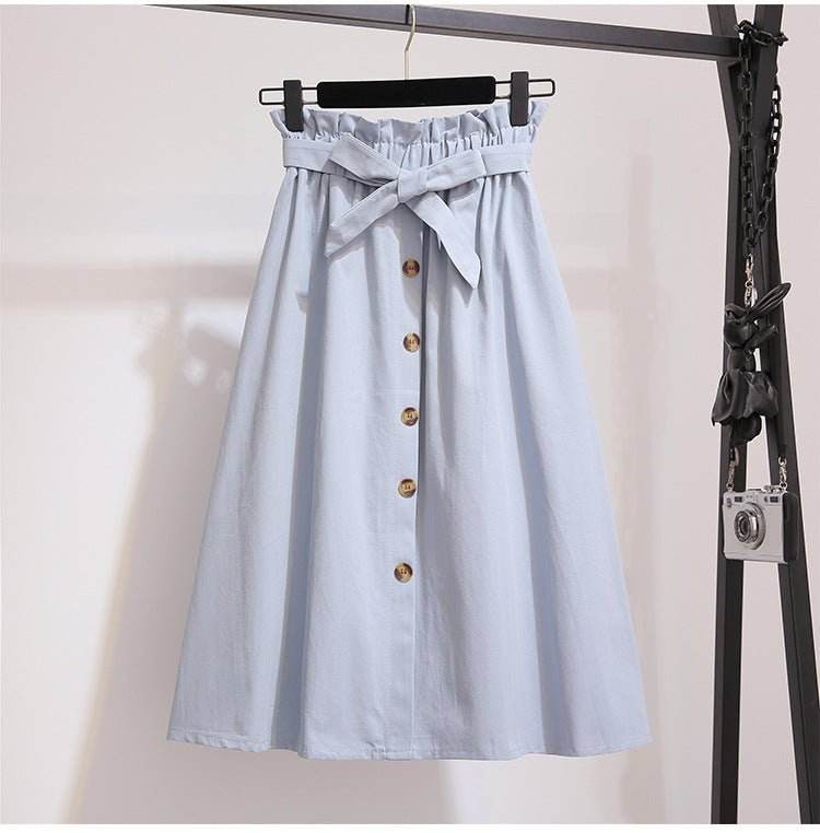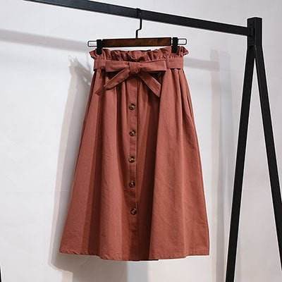 חצאית אלגנטית עם כפתורים וקשת במותן, זמינה במבחר צבעים מושלמים לכל עונה ולמראה נשי ומעודן.