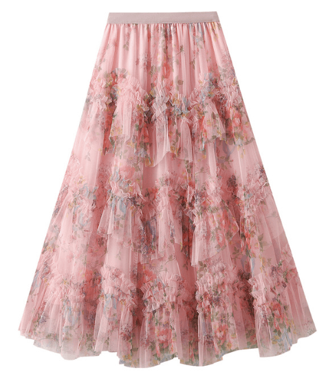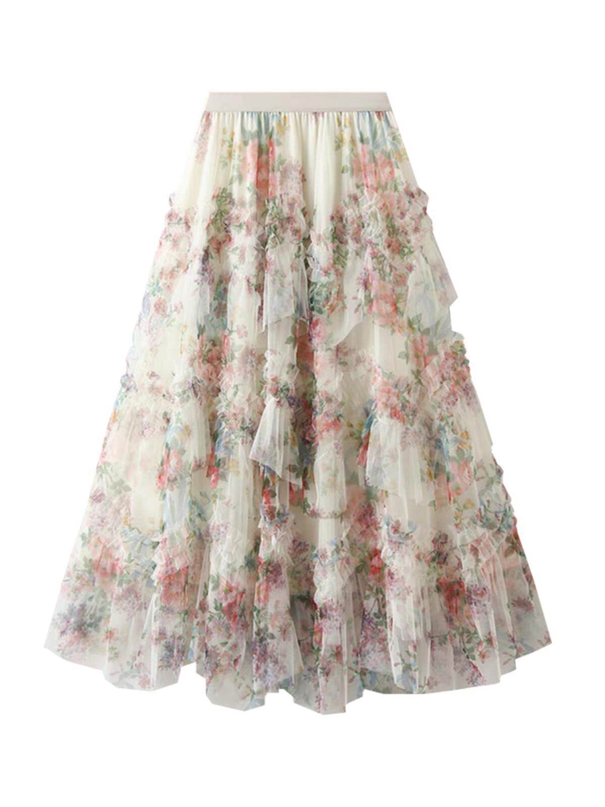 חצאית קסומה בשכבות טול מעוטרות בהדפס פרחוני צבעוני, מושלמת להוספת מראה רומנטי וקליל לכל אירוע או יציאה.