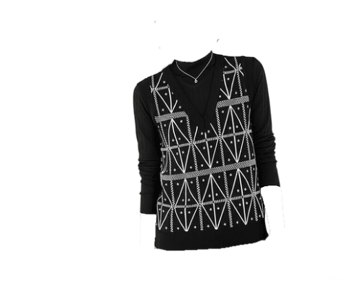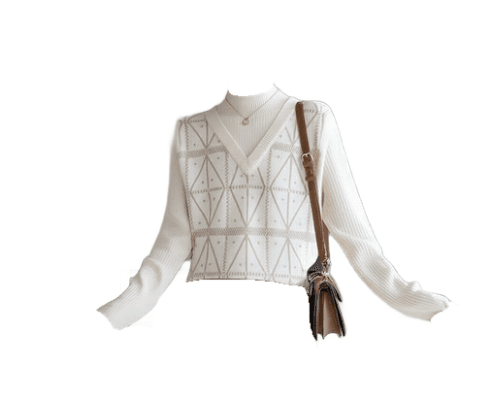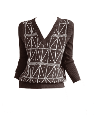 סריג אלגנטי בגזרת וי מחמיאה, עם דוגמה גיאומטרית מרשימה בצבע לבן על רקע חום קלאסי – מושלם למראה מתוחכם שמתאים גם לעבודה וגם לבילוי.