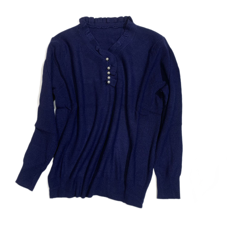 סוודר מחמם ונעים בגוון כחול כהה עם עיטורים עדינים של פנינים ומחשוף מעוצב עם גימור רך. מושלם לשילוב יום-יומי או לערב אלגנטי.
