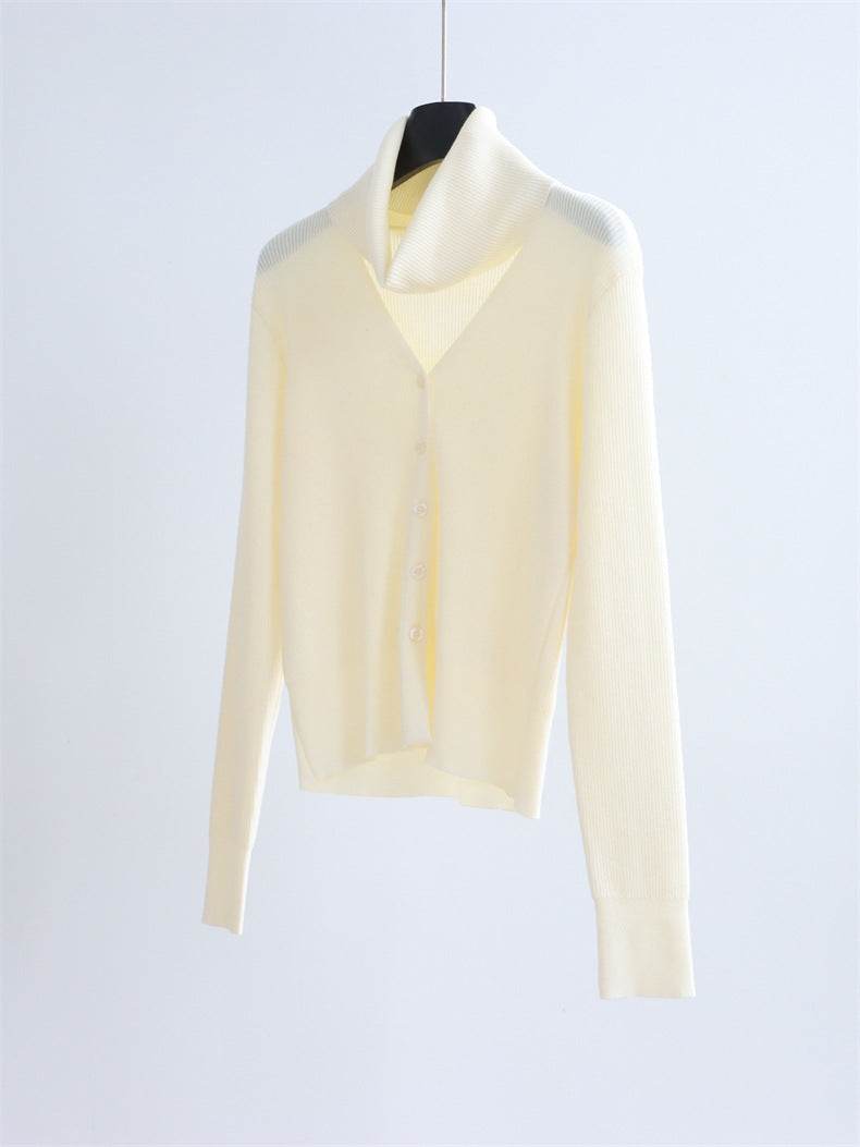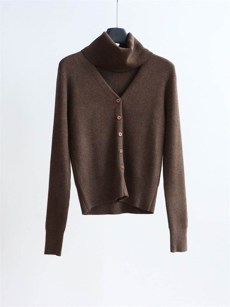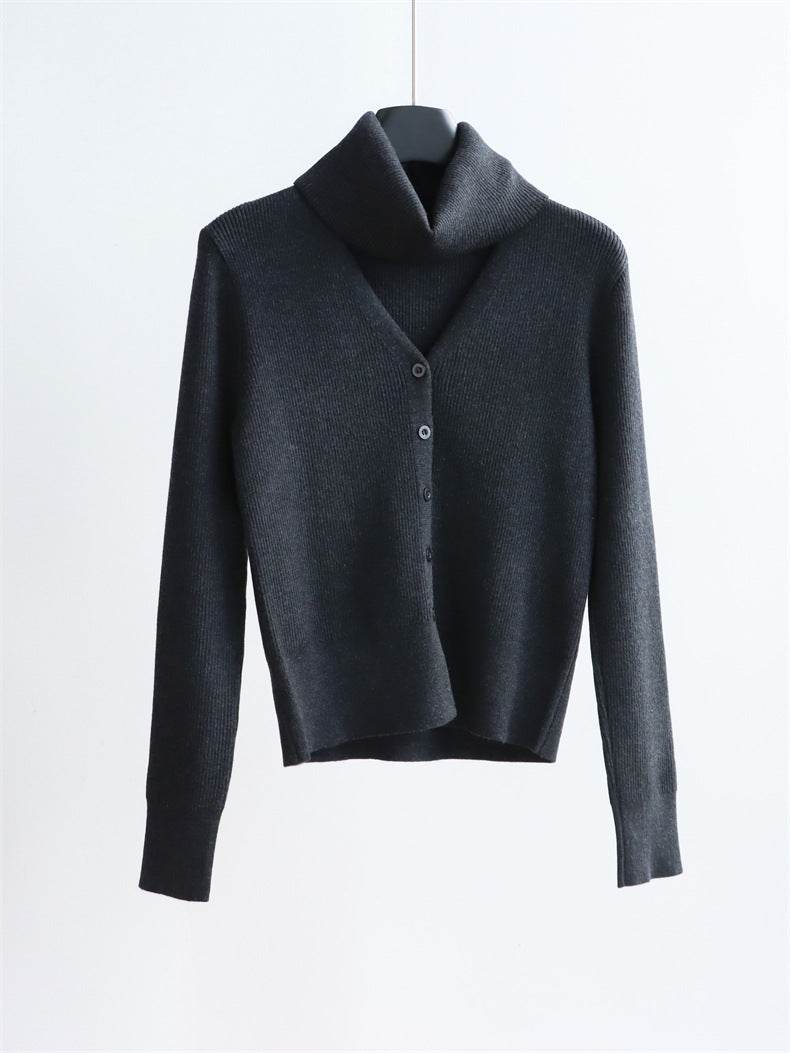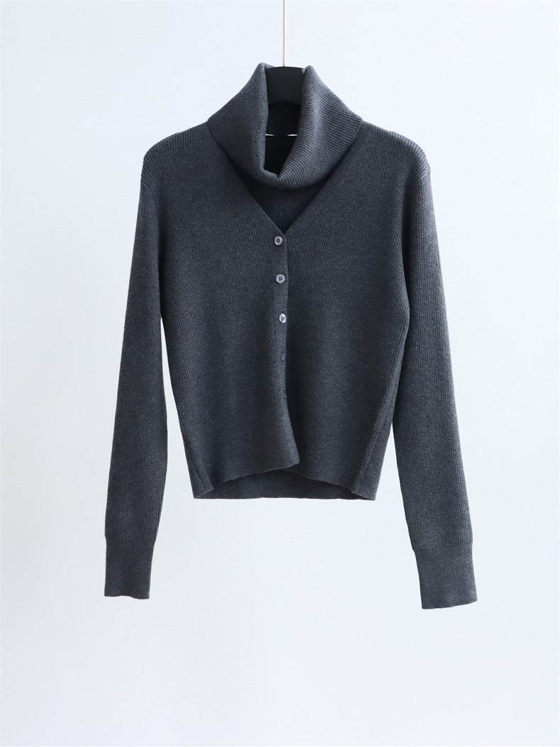 סוודר אלגנטי ורך עם תערובת צמר איכותית, בגוון אפור עמוק ונעים. בעל צווארון רחב ונופל בעיצוב נשי מתוחכם וכפתורים קדמיים דקים. מושלם למראה חורפי חמים, המשלב נוחות עם יוקרה שקטה.