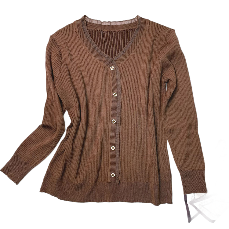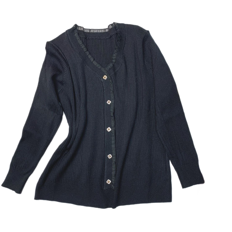 קרדיגן בגוון כחול עמוק עם כפתורי פרחים עדינים ותפרי ריב מושלמים. בחירה אלגנטית למראה יומיומי או רשמי.