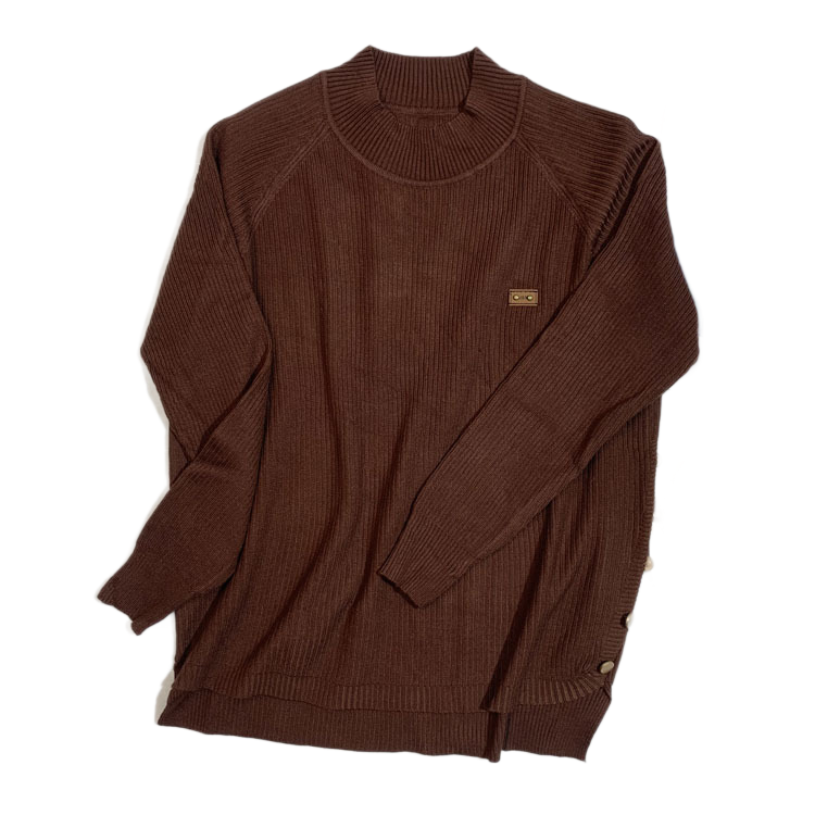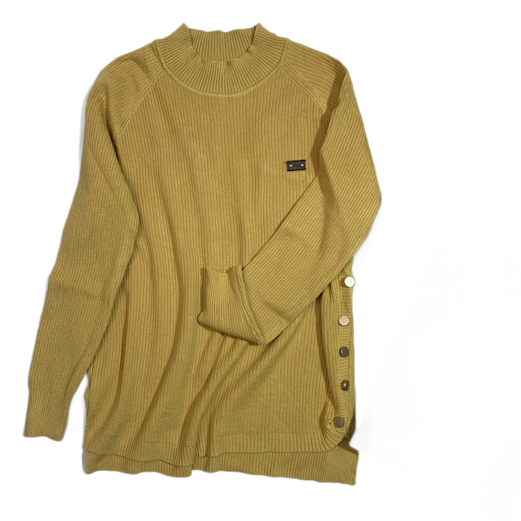 סוודר חם בגוון חרדל ייחודי עם גימורי ריב אלגנטיים ועיצוב כפתור צדדי. מושלם לימים קרירים ולמראה אופנתי ונוח.
