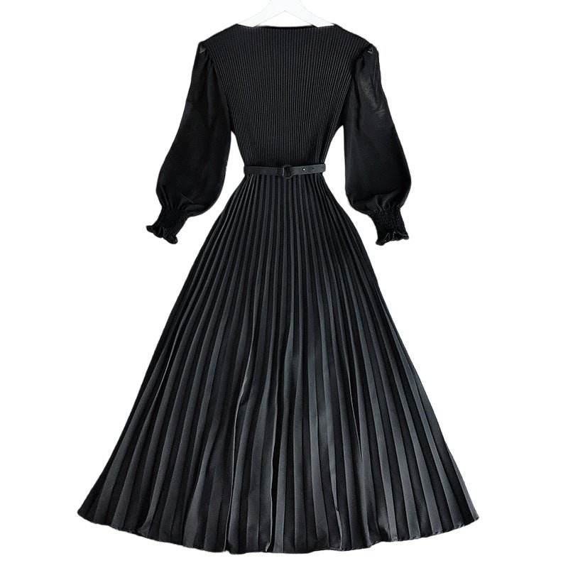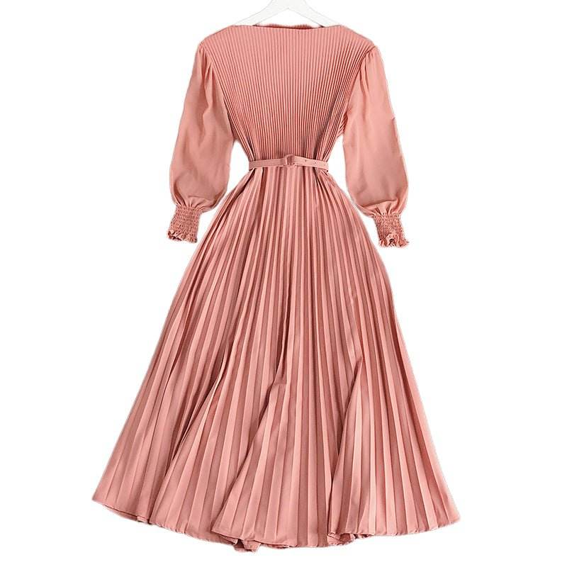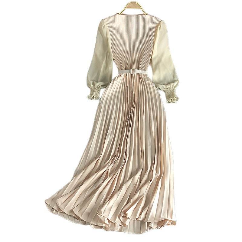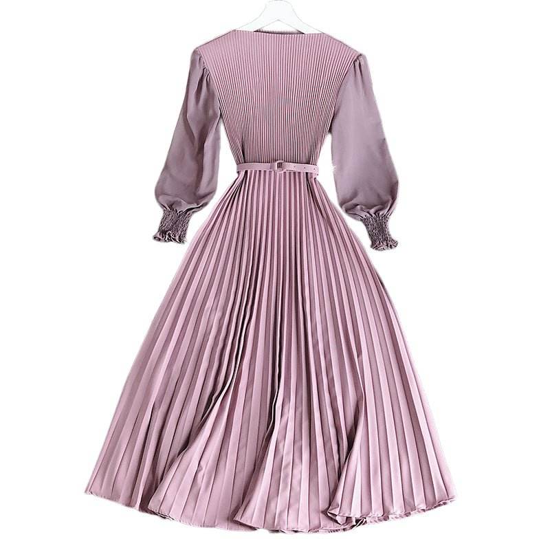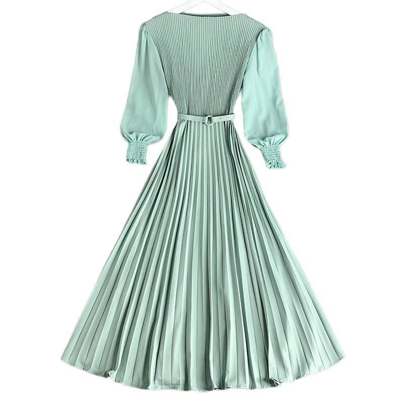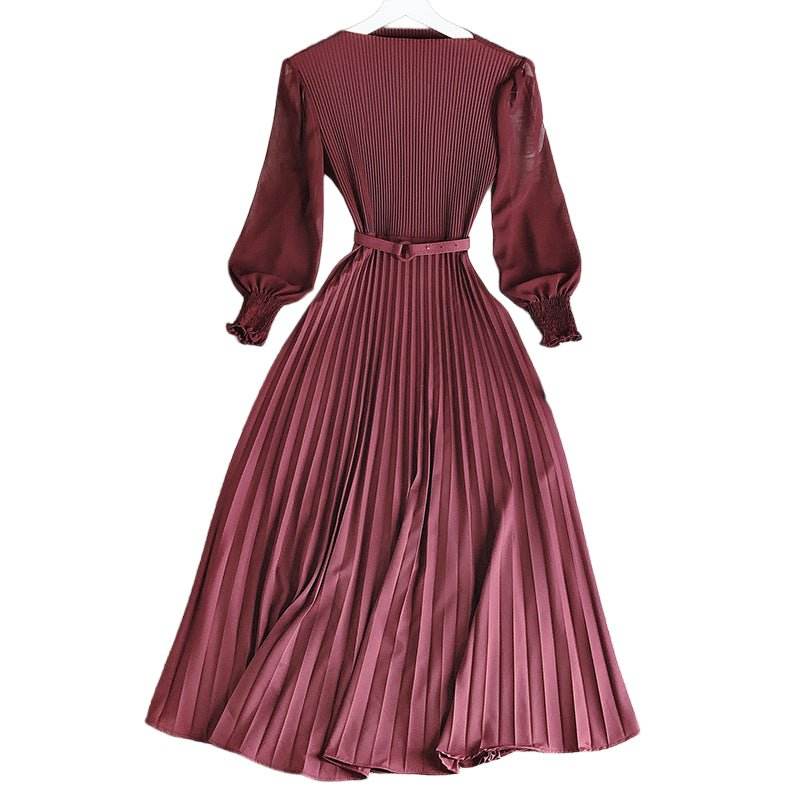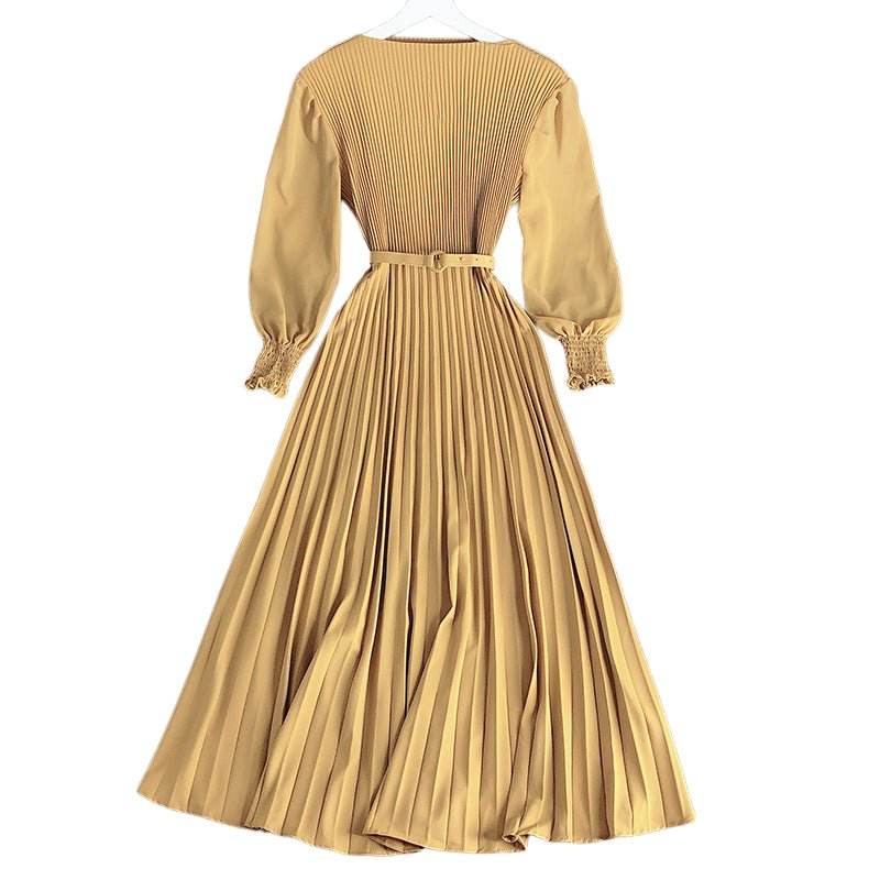 שמלה מרשימה עם חצאית פליסה רחבה, שרוולים ארוכים עם גימור אלגנטי וחגורה להדגשת המותן. בגוון חרדל חם למראה נשי וקלאסי.