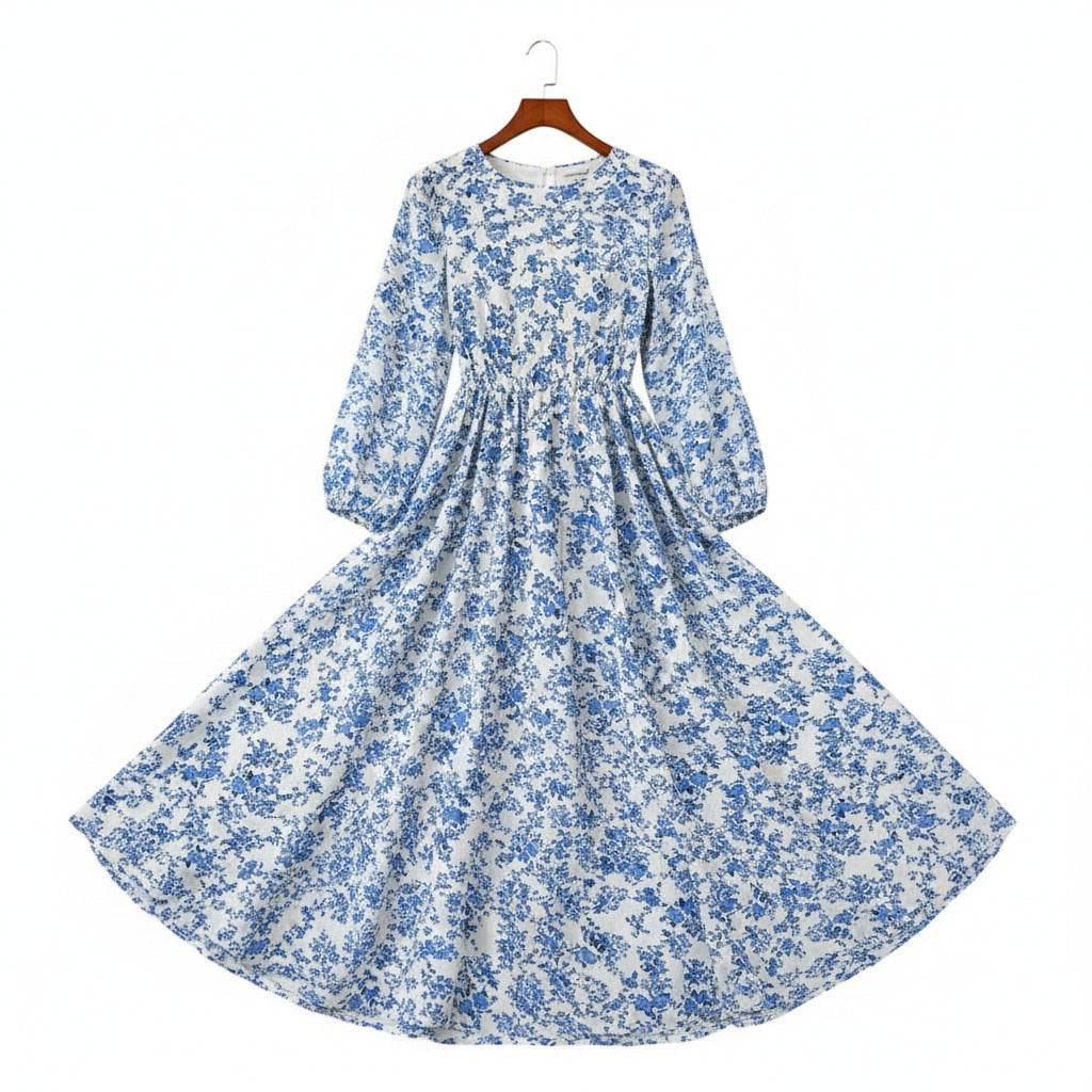 שמלה לבנה עם הדפס פרחים כחול ושרוולים ארוכים, בעיצוב נשי ורענן שמעניק מראה אלגנטי ומלא חן לכל יציאה. ✨