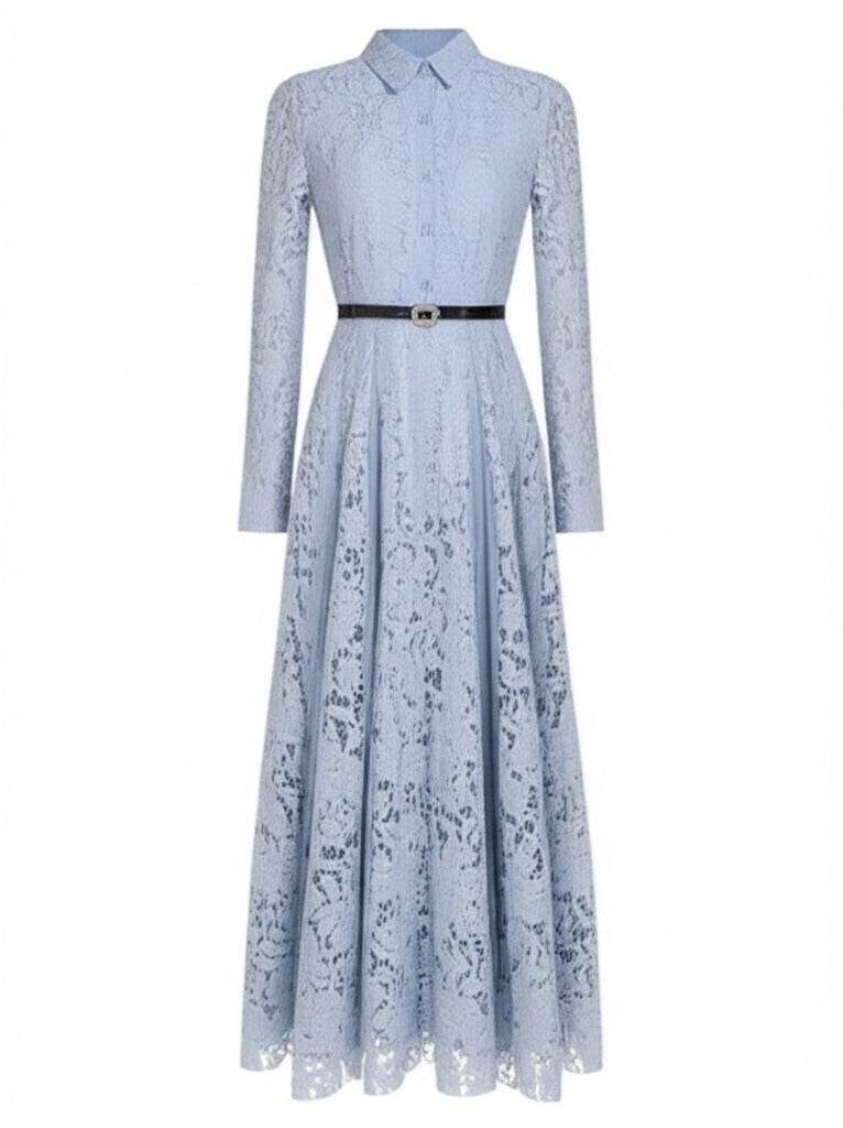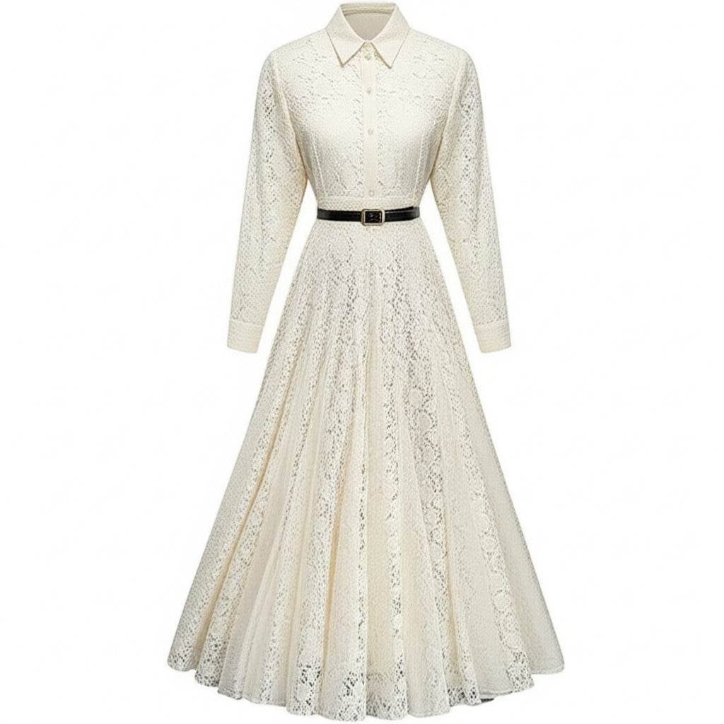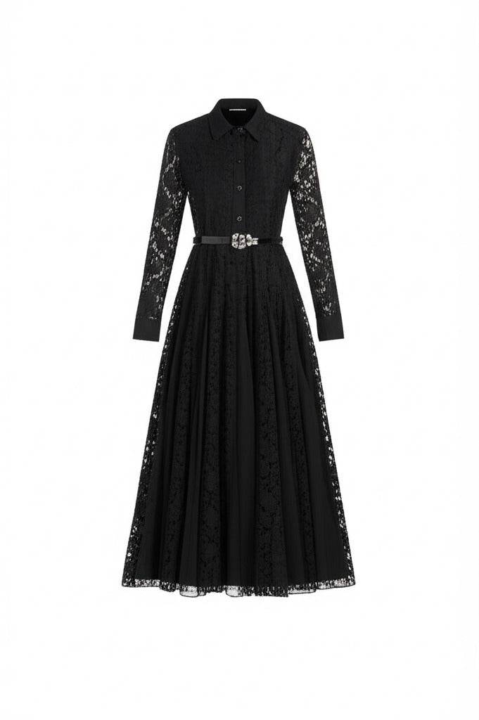 שמלת מידי מעוצבת בתחרה יוקרתית עם שרוולים ארוכים, כפתורים וחגורת מותן דקה – שילוב מושלם של קלאסיות, נשיות ויוקרה. ✨