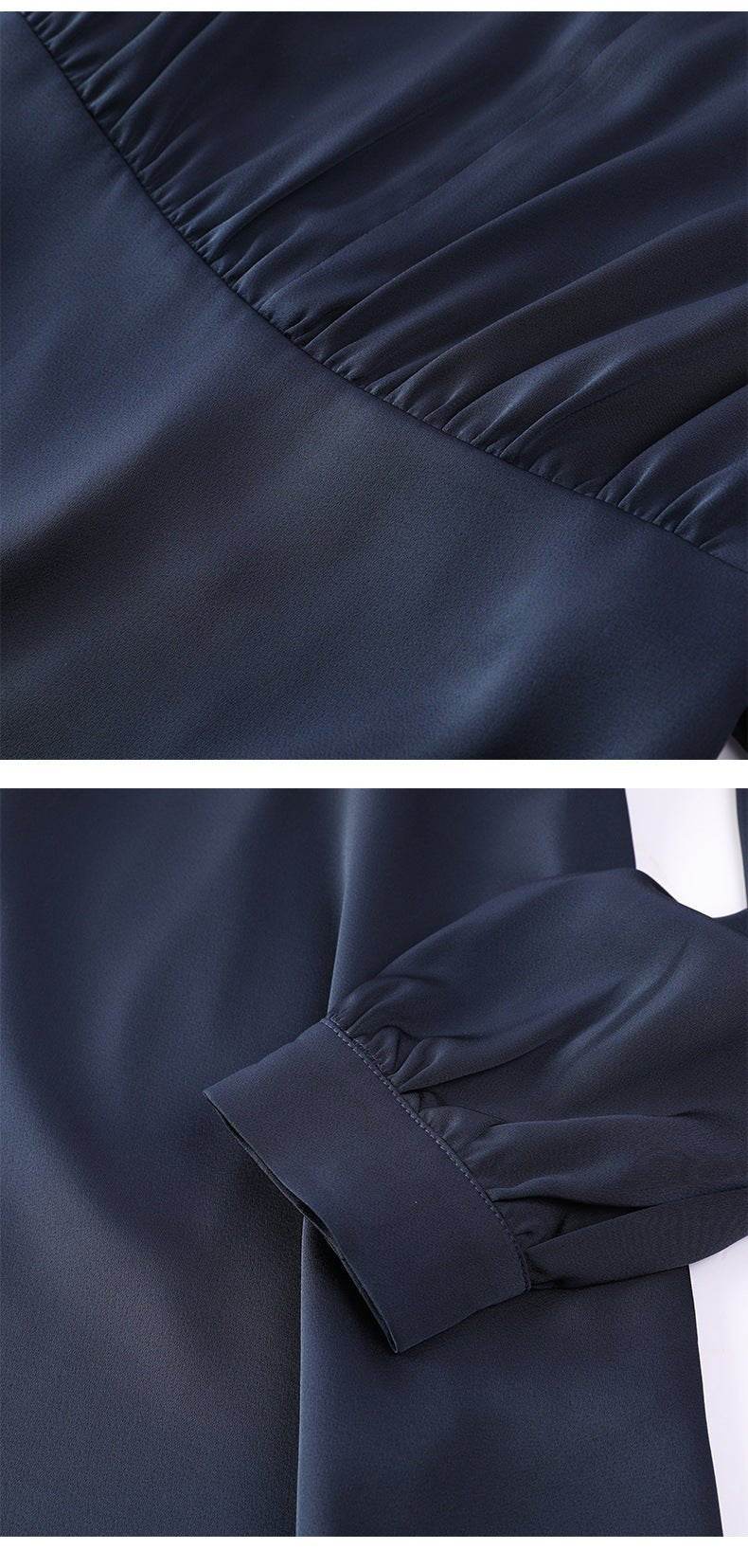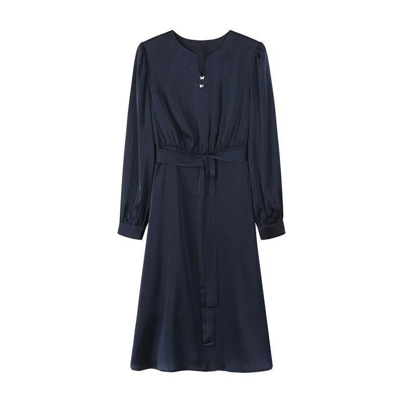 שמלה יוקרתית בגוון כחול כהה, עם עיטורי פרפרים עדינים בחלק העליון וחגורת קשירה להדגשת המותן.