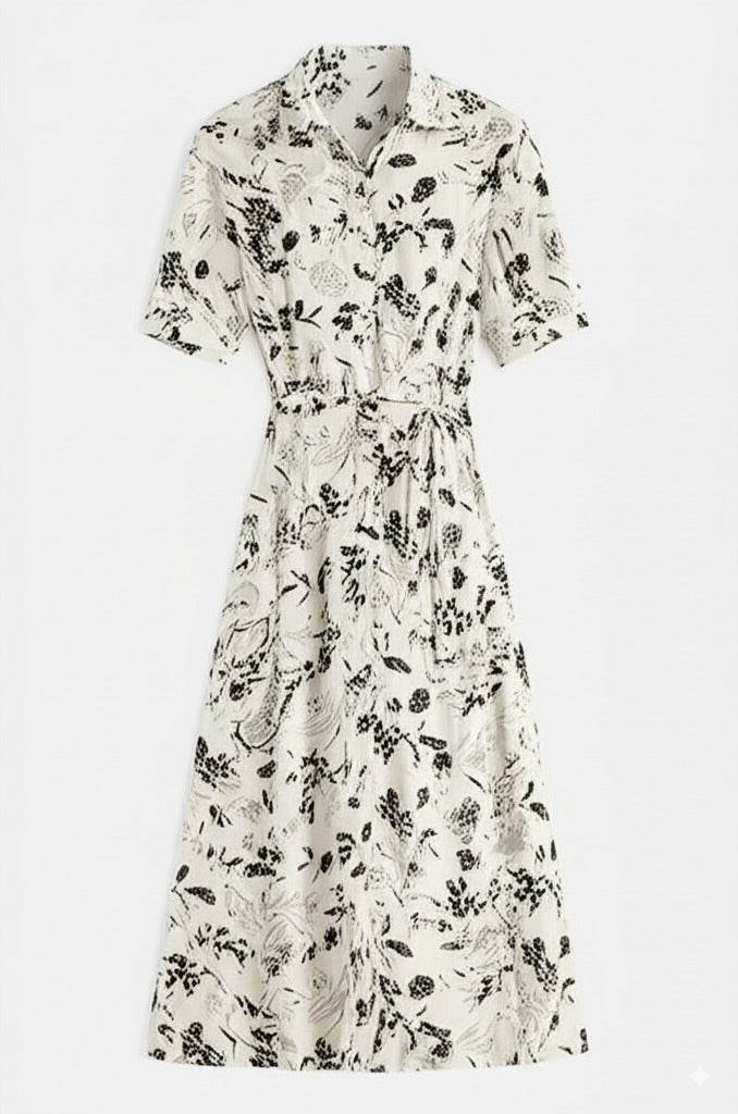 שמלה בהדפס פרחים עדין בצבעי שמנת וזהב, עם שרוולים קצרים וכפתורים בחזית – מעניקה מראה קלאסי, רענן ונשי לכל הזדמנות. ✨