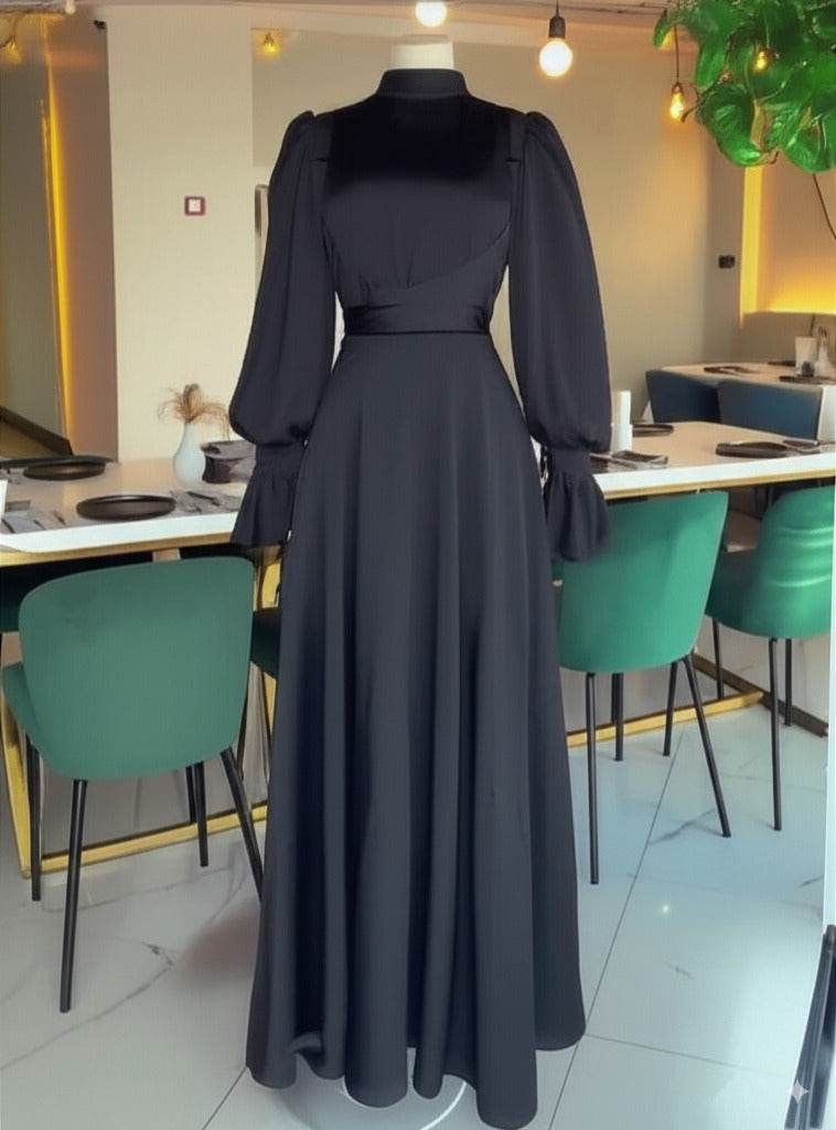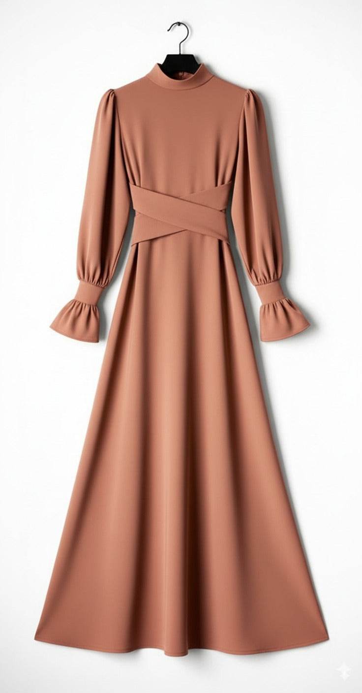 שמלה ארוכה עם שרוולים נפוחים וגזרה מחמיאה במותן, מעניקה מראה יוקרתי, צנוע ונשי שמתאים לכל אירוע. ✨