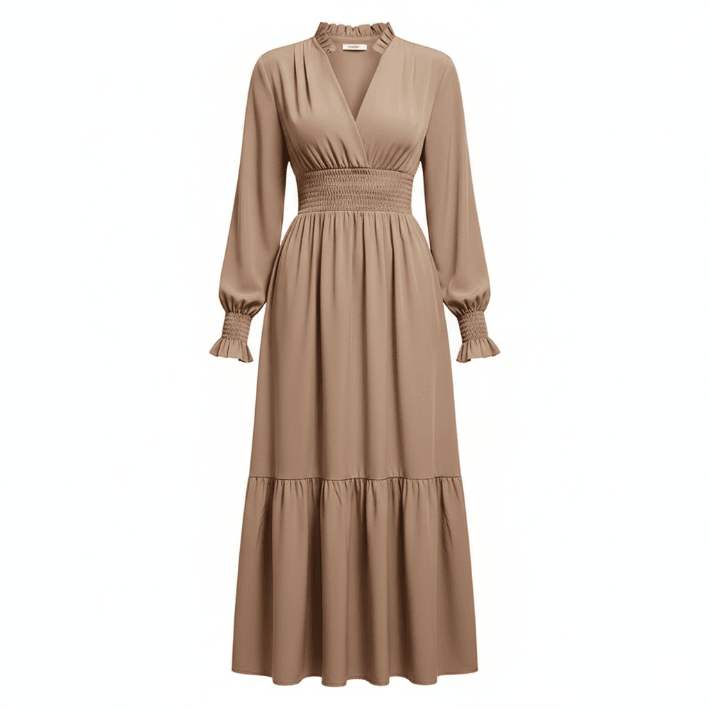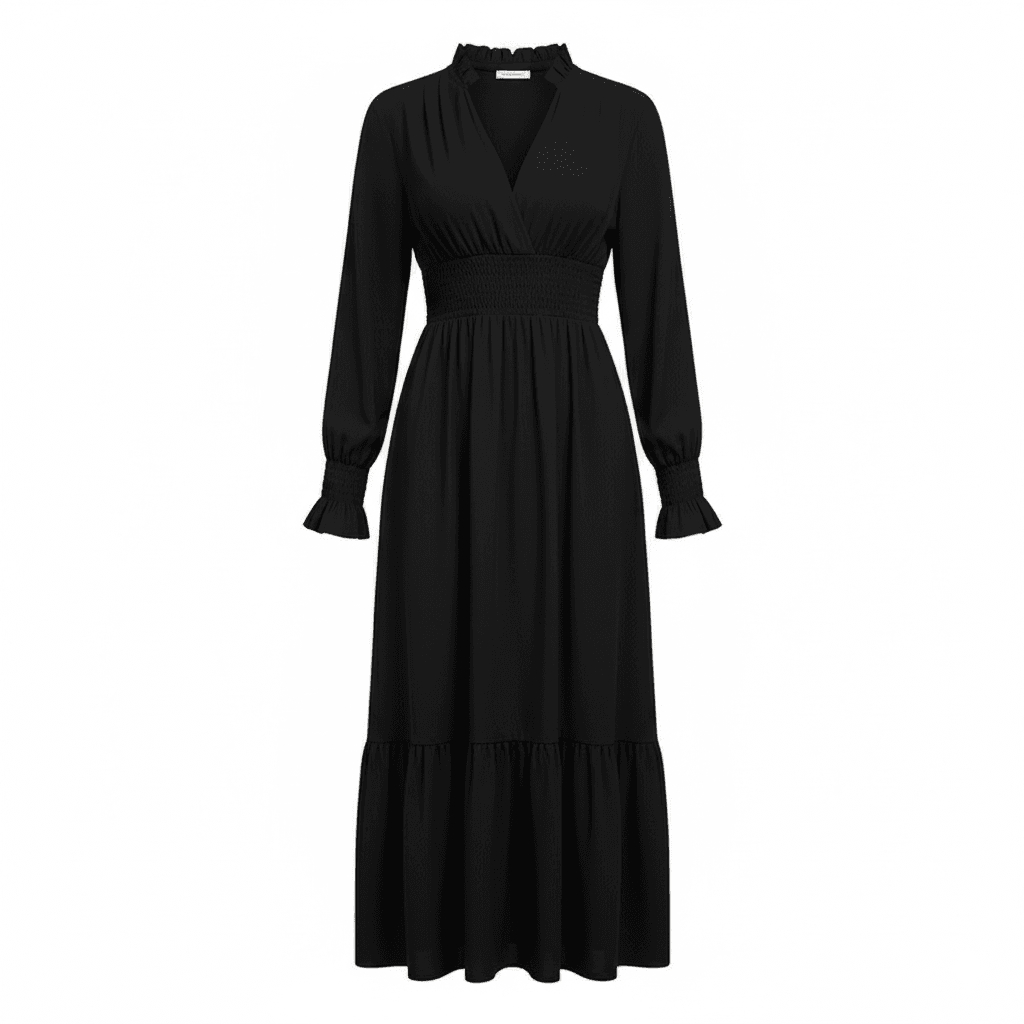 שמלה ארוכה בגוון ירוק עמוק עם גזרה נשית מחמיאה, שרוולים ארוכים ומותן אלסטית המדגישה את הקימורים – שילוב מושלם של יוקרה, נוחות וסטייל קלאסי.