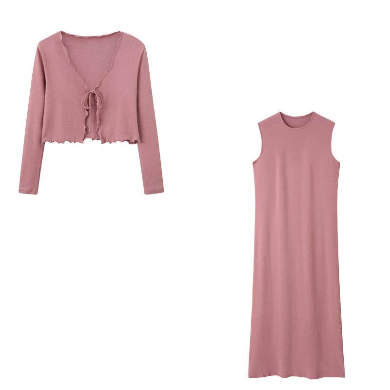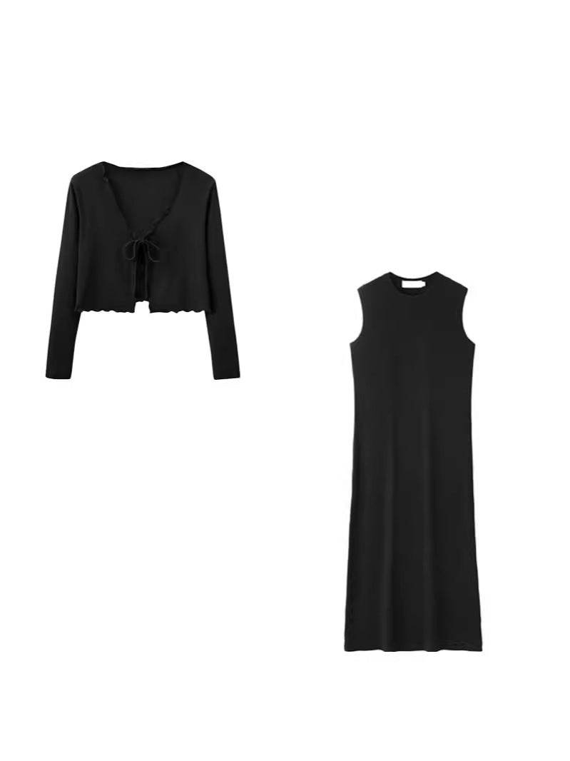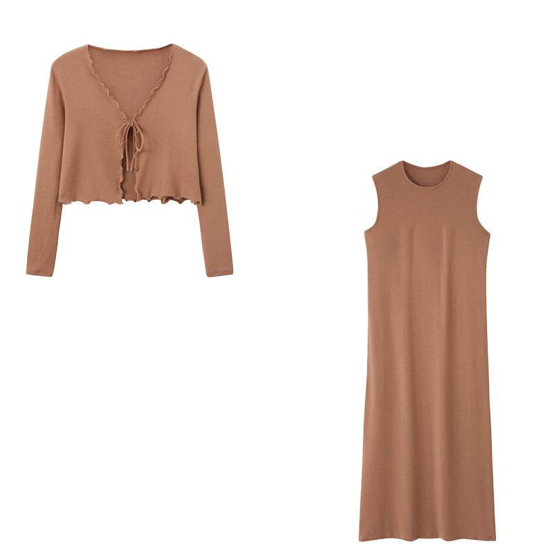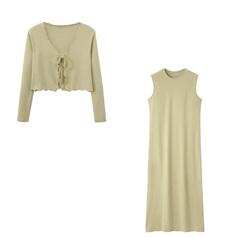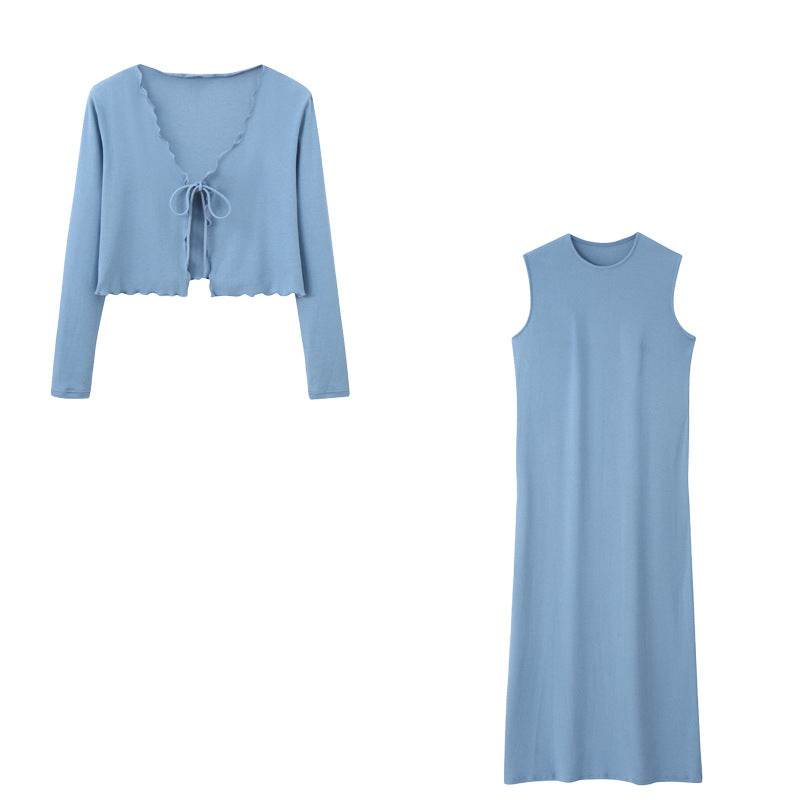 סט נשי ומעודן בגוון תכלת שלו, כולל שמלה ארוכה בגזרה מחמיאה וקרדיגן קליל לקיץ – מראה רגוע, צנוע ואלגנטי לכל יום.