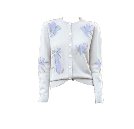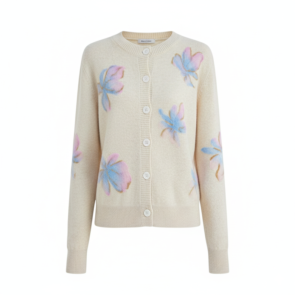 קרדיגן רך ונעים בגוון שמנת מעודן, מעוטר בפרחי פסטל עדינים שמוסיפים טאץ' נשי ואלגנטי – שילוב מושלם של חמימות וסטייל אביבי