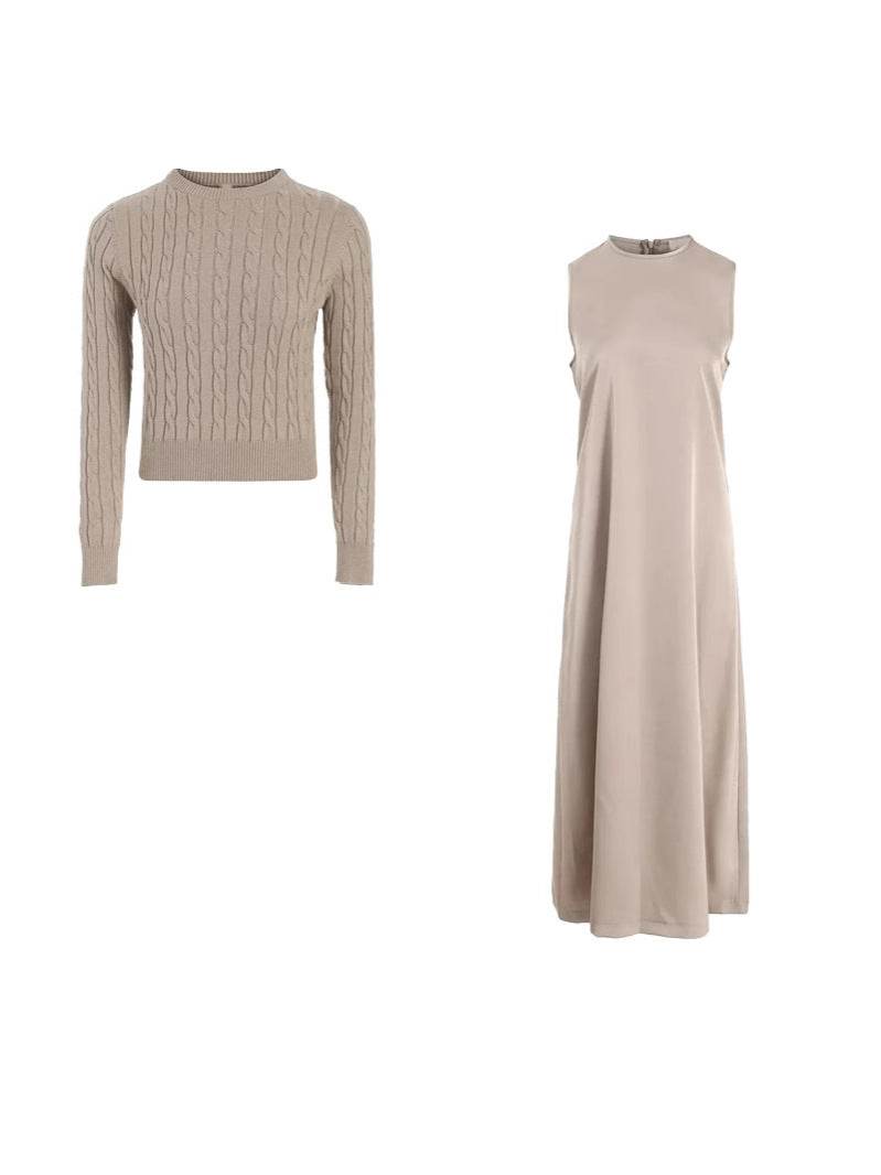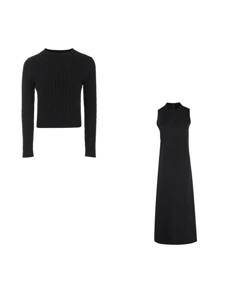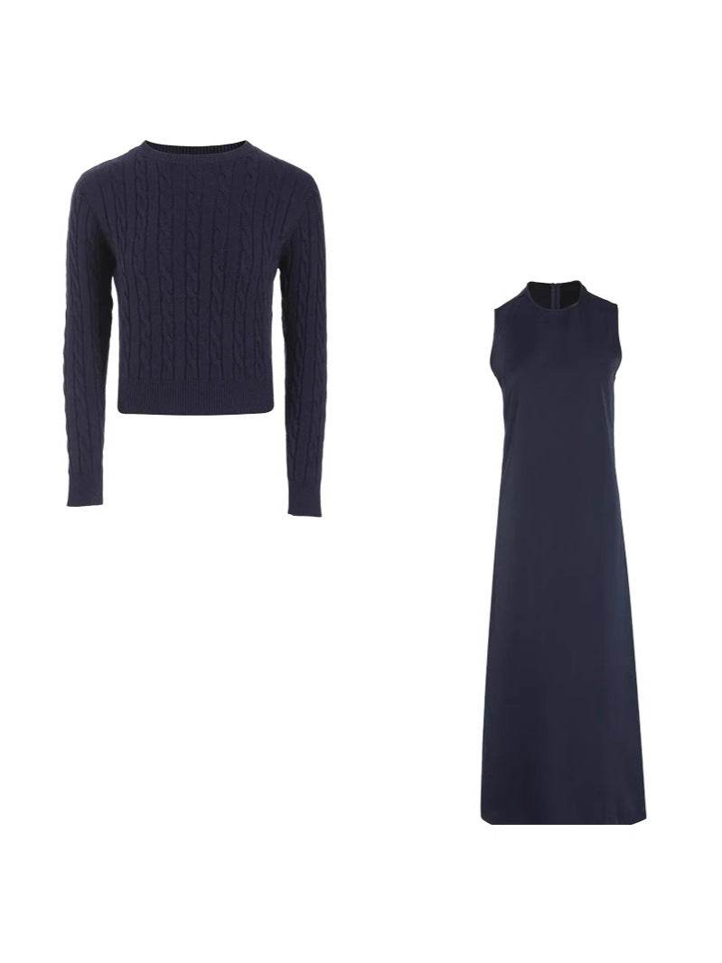 סט אלגנטי בגוון כחול עמוק, הכולל שמלה ארוכה בגזרה נשית עם סריג רך תואם – שילוב מושלם של חמימות, נוחות ואלגנטיות צנועה.