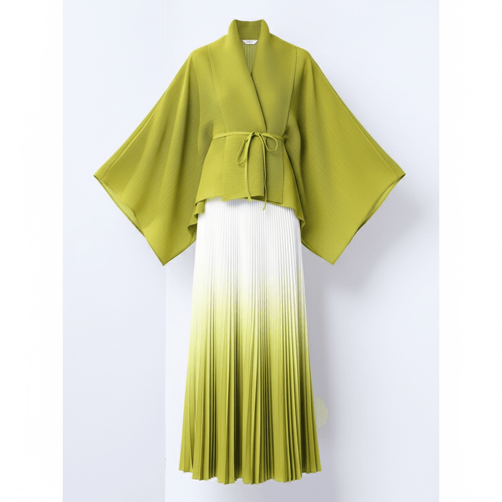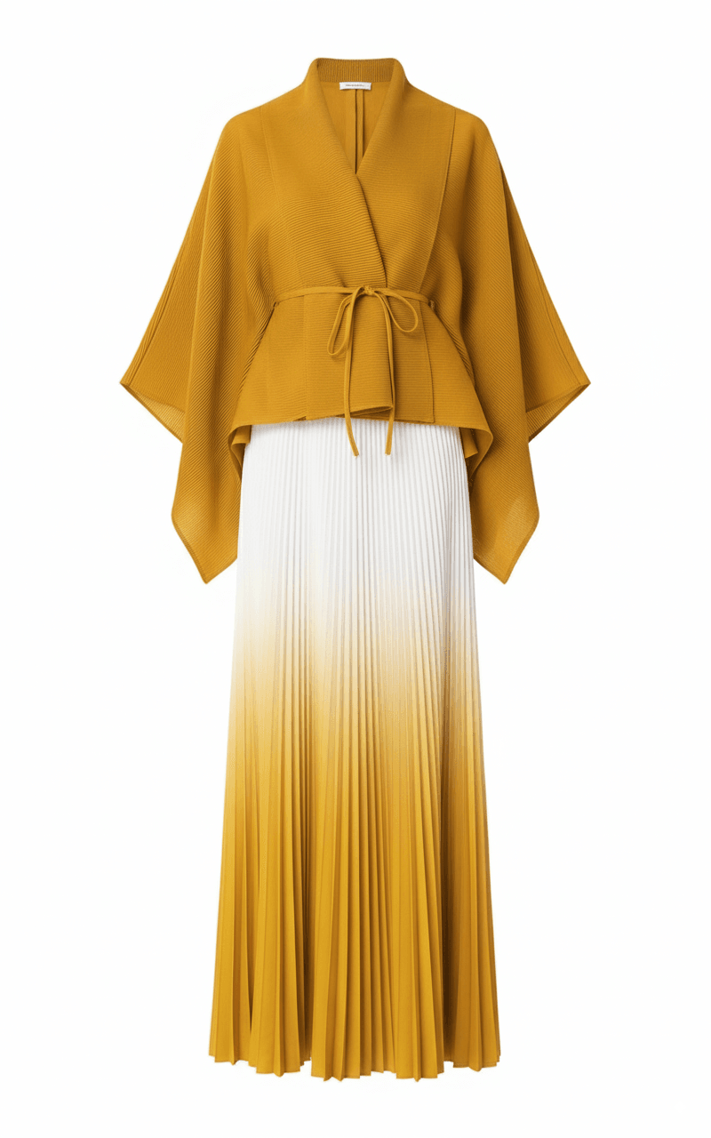 סט ייחודי הכולל עליונית בגוון חרדל עם קשירה עדינה וחצאית פליסה בגווני גרדיאנט לבן-כתום. מושלם למראה נשי, רענן ומלא שיק.