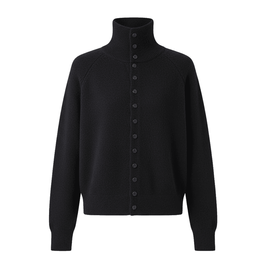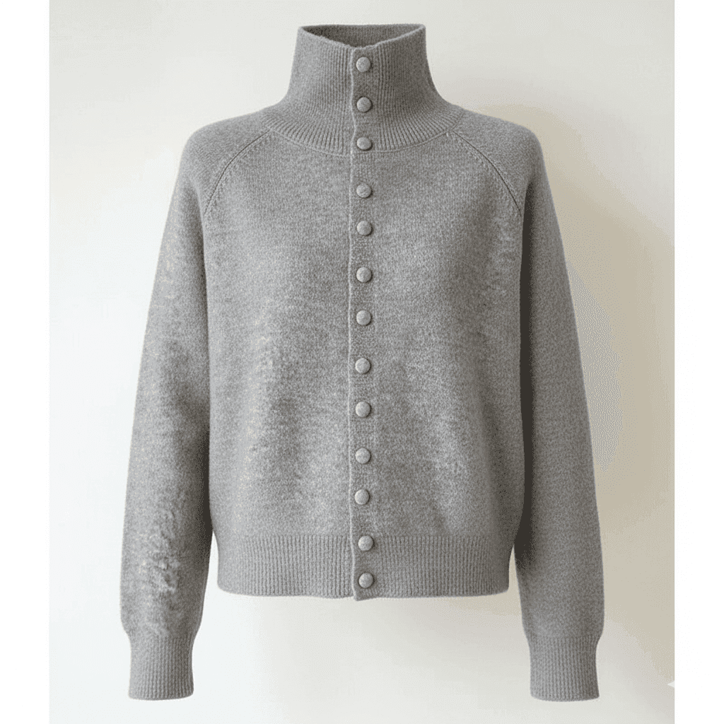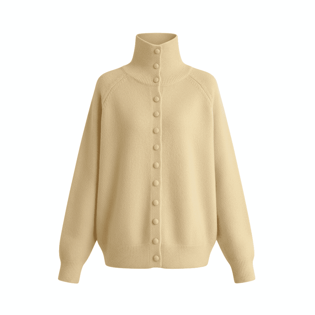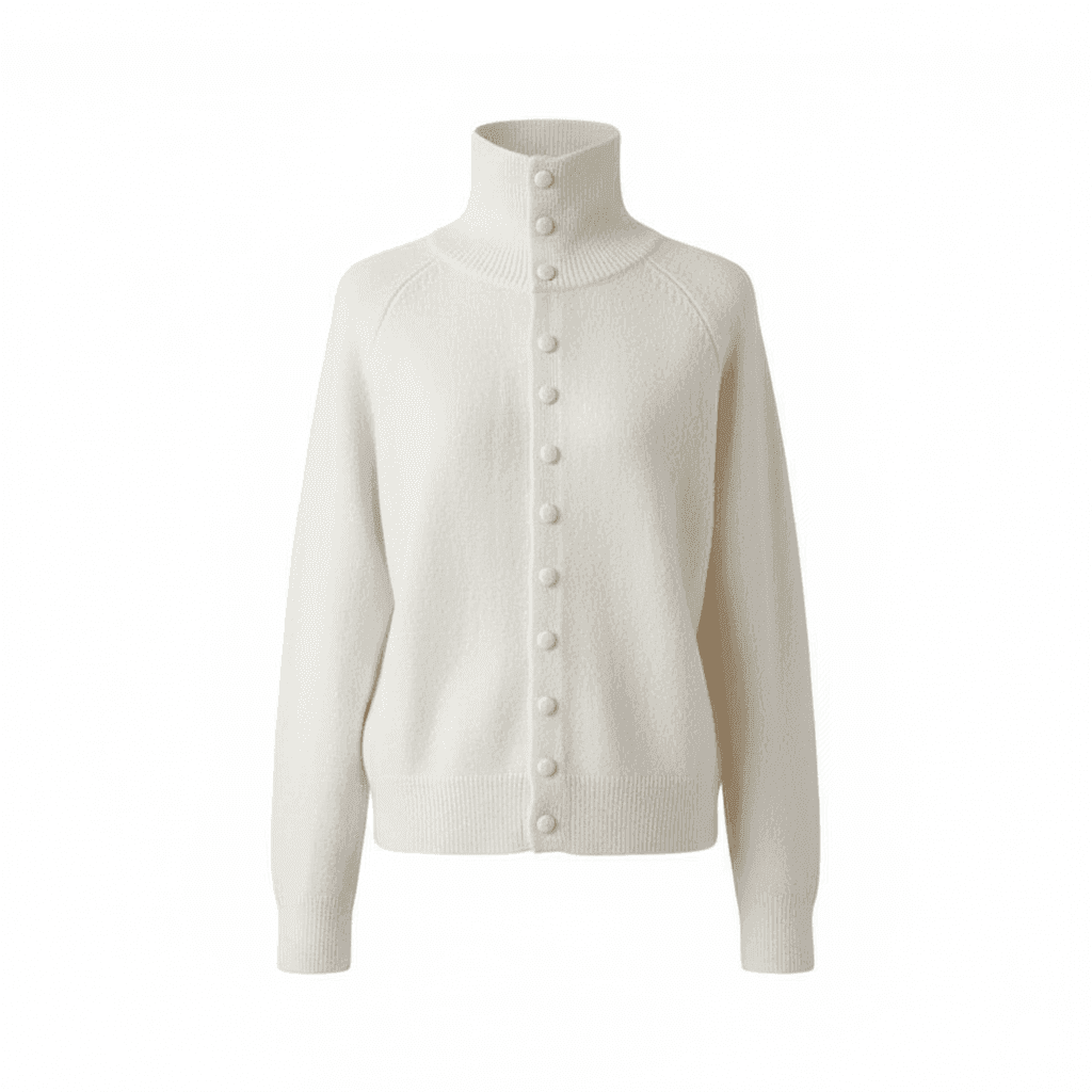 סוודר בגוון שמנת בהיר, עשוי תערובת צמר חמימה ונעימה למגע, עם כפתורים תואמים לאורך הצווארון הגבוה. מעניק מראה אלגנטי ונוח לעונה הקרה.